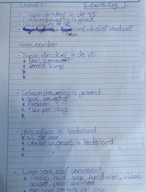 - Per thema schrijven ze in kernwoorden op waar het thema overgaat.