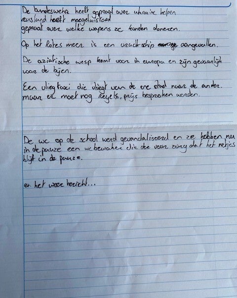 - De leerlingen beluisteren voor henzelf de nieuwsuitzending. Tijdens de nieuwsuitzending noteren ze de volgende zaken: