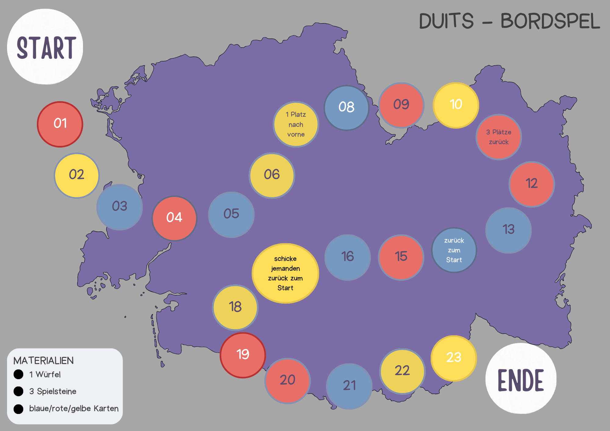 - De kleur waarop het pionnetje op komt te staan, geeft aan welk gekleurd kaartje de leerling moet pakken. Echter hebben sommige vakken extra instructies zoals: plek terug, terug naar start of iemand anders naar start sturen.